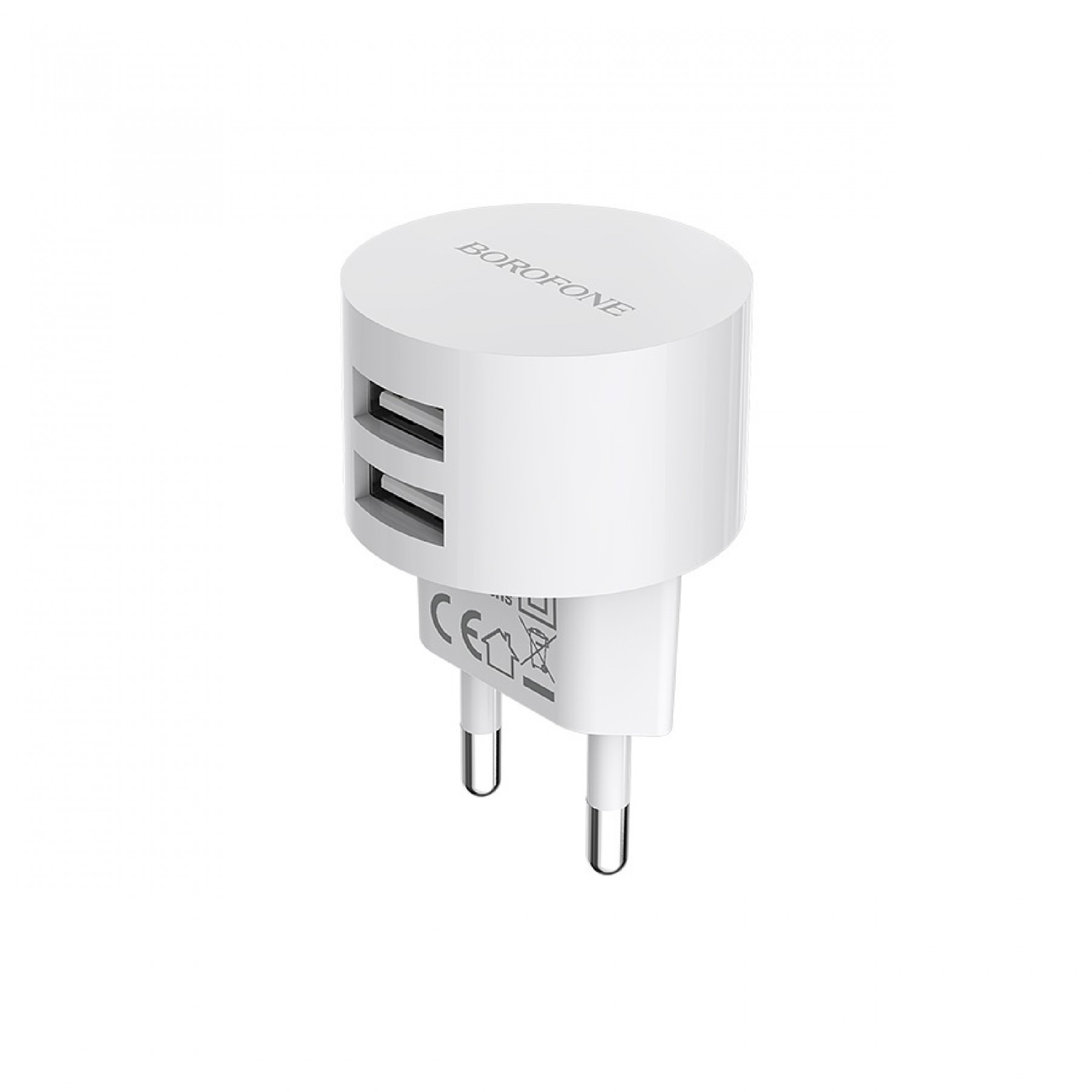 Πριζάκι Borophone γρήγορης φόρτισης(2.4Α) με διπλή υποδοχή. Χρώματος λευκού. Περιέχει μόνο την πρίζα χωρίς καλώδιο και Smart ID.